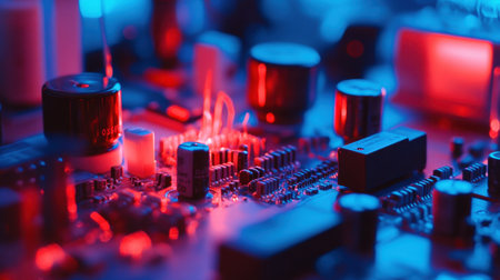 A detailed close-up image showcasing a vibrant circuit board with illuminated components. The blue and red lighting creates an abstract and futuristic atmosphere, highlighting the intricate design. Perfect for technology themes.
