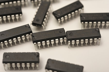 Microchips in a DIP case on a white background. A microelectronic element. Black microchips.