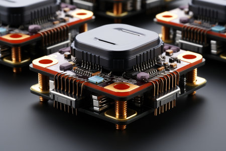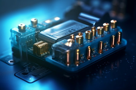 This close-up image showcases an electronic circuit board component featuring various chips and pins, illuminated by soft light. Perfect for technology themes.