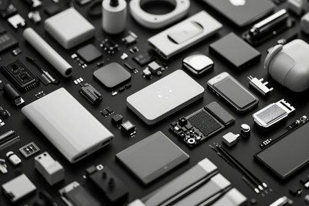 A captivating overhead view of diverse electronic components scattered across a dark surface, showcasing intricate designs and vibrant colors that represent modern technology.
