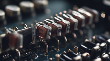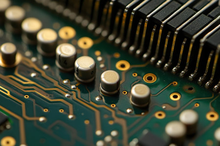 This close-up image depicts an electronic circuit board with various capacitors and resistors, showcasing intricate details of modern technology and engineering design.