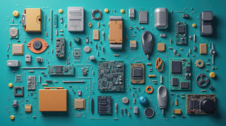 Various electronic components are carefully arranged on a teal background, showcasing circuit boards, sensors, and enclosures. This layout emphasizes the diversity of modern technology.