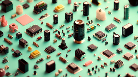A vibrant array of electronic components showcasing resistors, capacitors, and circuit boards. Ideal for creative projects, DIY electronics, or tech innovations.