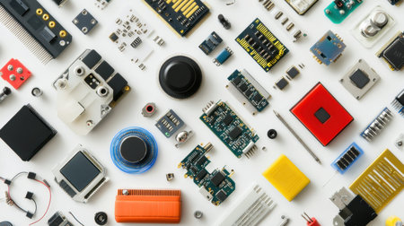 This image features a vibrant flat lay of various electronic components arranged artistically on a bright background, showcasing innovation and technology.
