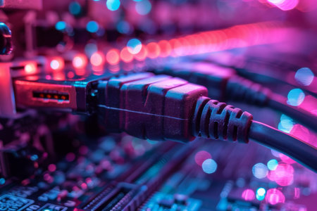 This close-up image features a glowing Ethernet cable connector, illustrating the technology behind digital communication. Perfect for tech-oriented themes.