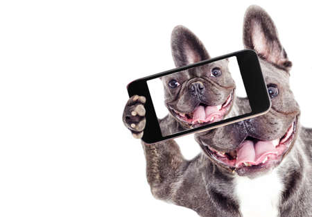 bad hair day dog ready to look beautiful at the wellness spa salon, isolated on white background, taking selfie with smartphone or tablet
