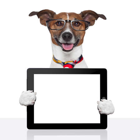 Paws of black and tan dog lie on screen of digital tablet with wireless pencil for drawing, note taking, marking up documents and web design, top view, copy space, white background.