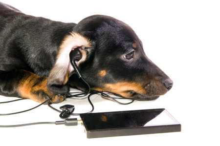 The black dog dachshund lays and listens to music through mp3 player closeup