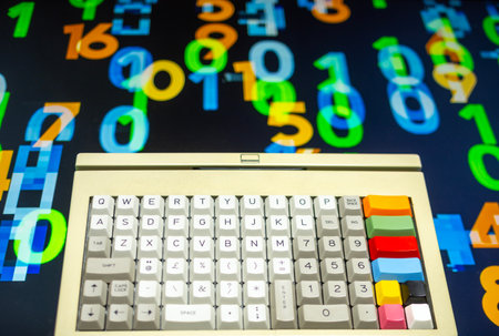 vintage computer keyboard with streaming data and code