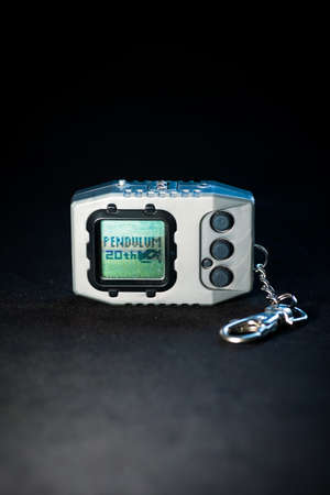 BELARUS, NOVOPOLOTSK - APRIL 25, 2020: Tamagotchi toy on a green background close up