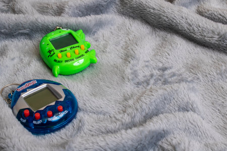 BELARUS, NOVOPOLOTSK - 04 MAY, 2021: Two tamagotchi toys copy space