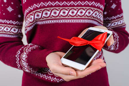 Perfect surprise for new year! Cropped close up photo of modern stylish trendy smart phone in woman's hands with bow isolated on grey background