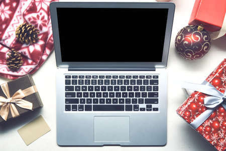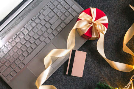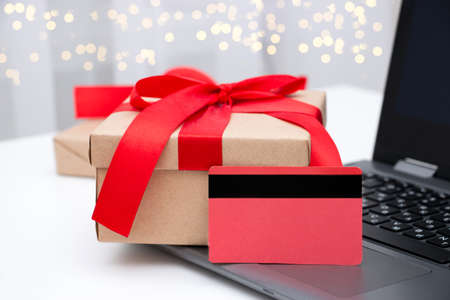 Christmas shopping online with a credit card for the holiday. Laptop with gifts on the table next to fir branches and a garland of lights.