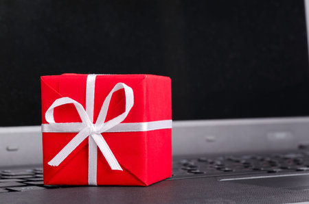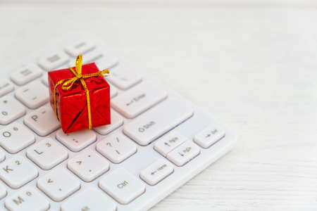 Red gift box on computer keyboard in online shopping concept. Selective focus