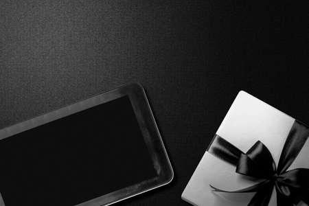 White gift box with a black ribbon and tablet with a black background. Black Friday concept