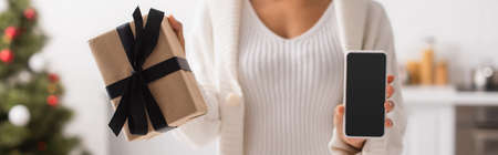Cropped view of african american woman holding cellphone with blank screen and present, banner
