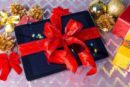 Tablet pc for Christmas with gifts, decorations on table.