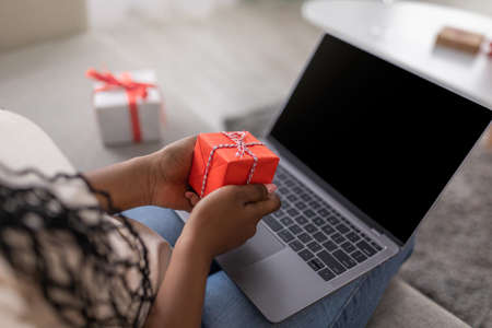 Unrecognizable black woman using laptop with blank screen, holding gift box, over shoulder shot, closeup. African american lady having Birthday party online, celebrating with boyfriend during lockdown