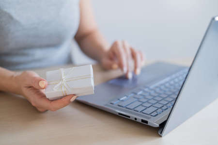 Faceless woman holding gift box and typing on laptop.