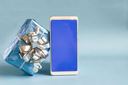 The concept of online trading. A phone with a blue screen and a gift in a bright package on a blue background close-up.