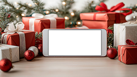 Smartphone in Christmas red background view with tree, gift and decoration