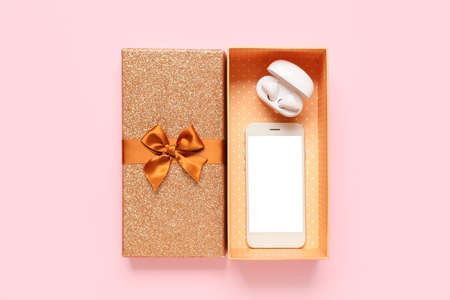 Gift box with mobile phone and earphones on pink background