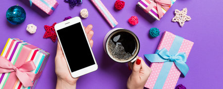Top view of a woman holding a phone in one hand and a cup of coffee in another hand on purple background. Christmas decorations and toys. New Year holiday concept. Mockup.