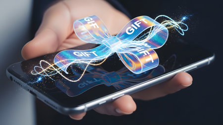 A hand holds a smartphone displaying a holographic gift bow with the word GIFT repeated and...