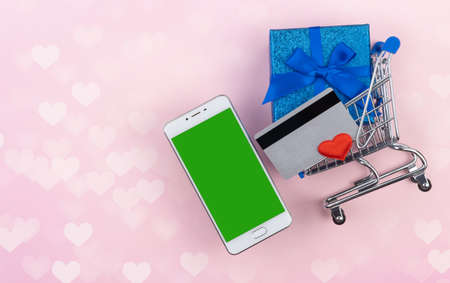 smartphone, a credit card, and a shopping cart. the concept of online shopping for gifts for Valentine's Day. gifts on the internet. holiday discounts