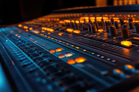 The sound mixer features various controls and dials, highlighted by glowing orange accents, set in a modern recording studio environment. Perfect for audio production and mixing.