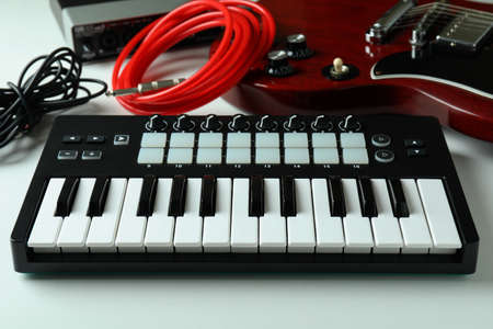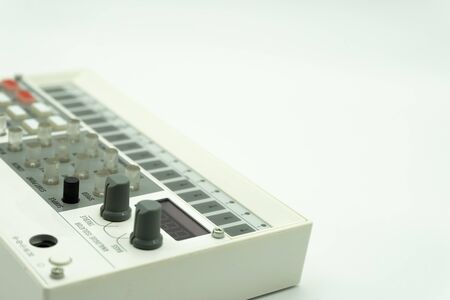 White analog synthesizer sampler with knobs and keys. Audio equipment for musical production. Drum machine. Isolated on white background. Music concept.