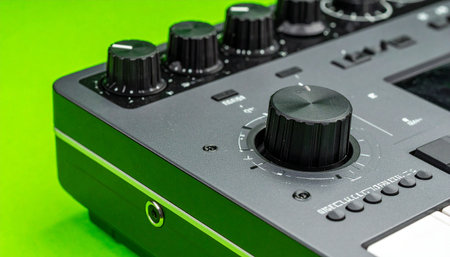 Professional audio mixer console with black knobs to equalize sounds. Audio recording studio tool. Music and entertainment concept