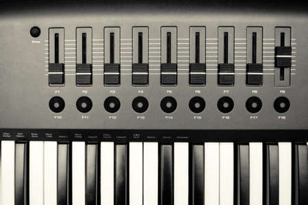 Close up of electronic synthesizer keyboard. 3d rendering toned image
