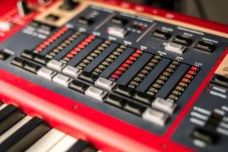 Close-up of the hammond section of a professional red classic stage and live concert keyboard, with keypad and control LEDs