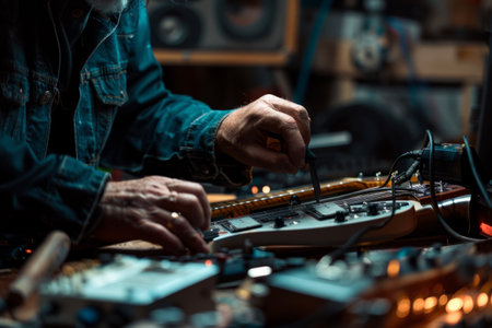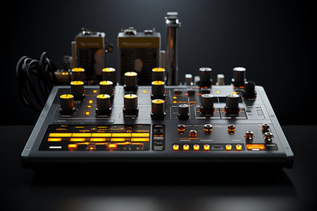 Synthesizer control knobs against the background of the musician's blurry hands while creating electronic music