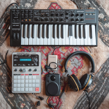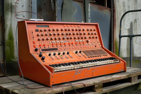In a lively music studio, an orange vintage synthesizer sits prominently, ready to produce captivating melodies. Various knobs and keys hint at endless creative possibilities.