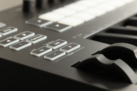 A detailed close-up view of a MIDI synthesizer controller showcasing the keys and controls, perfect for representing music technology and creativity.