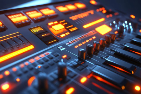 Close up view of a digital music production studio control panel with glowing keyboard and interface