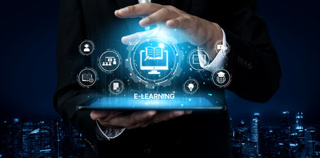 E-learning and Online Education for Student and University conceptual . Graphic interface showing technology of digital training course for people to do remote learning from anywhere.