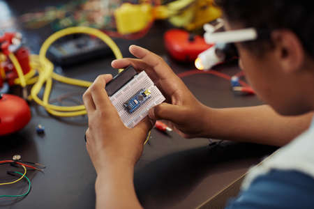 Portrait of cute boy wearing glasses and experimenting with electric circuits while building robots during engineering class in school