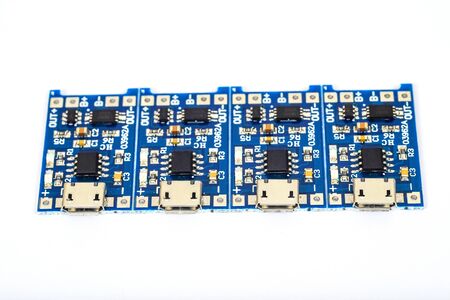 Assorted electronic components and circuit boards on white background