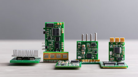 Explore a close-up view of multiple electronic circuit boards featuring intricate designs, components, and connections set against a minimalist wooden background.