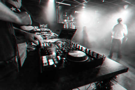 Dj mixes the track in the nightclub at a party. depth of field. closeup.
