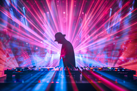 DJ mixer disco illuminated by searchlights