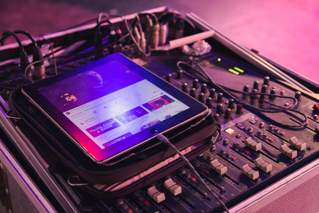 Phuket, Thailand - 20 october 2018 : an ipad open some music from video popular website put on the sound mixer
