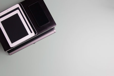 top view of mobile, hhd, black notebook arranged neatly on black background and light enters from the bottom