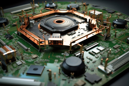 Electronic motherboard and isometric processor, microchip parts, high angle view