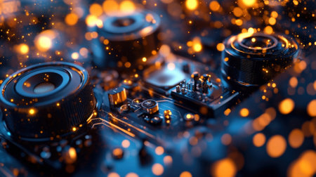 This image presents a detailed view of a computer circuit board. It showcases a complex arrangement of electronic components, including chips, capacitors, and connectors. The composition features a macro perspective, highlighting intricate details and textures. The lighting emphasizes the arrangement of the elements, suitable for various technological and industrial applications.
