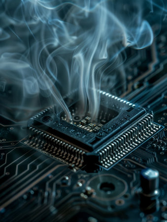 Close-up of a smoking computer chip, depicting technology failure or system overheating on a detailed motherboard.