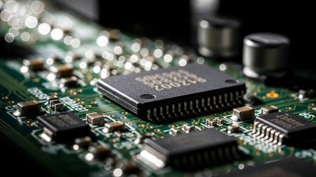 Close-up of a green circuit board with a microchip in focus, showing the intricate details of electronic technology.
